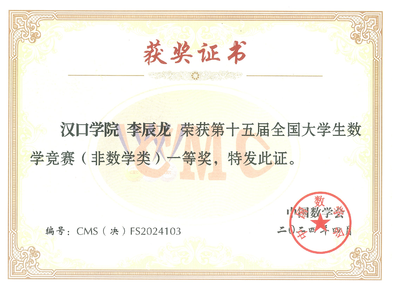 李辰龙荣获第十五届全国大学生数学竞赛(非数学A类)一等奖