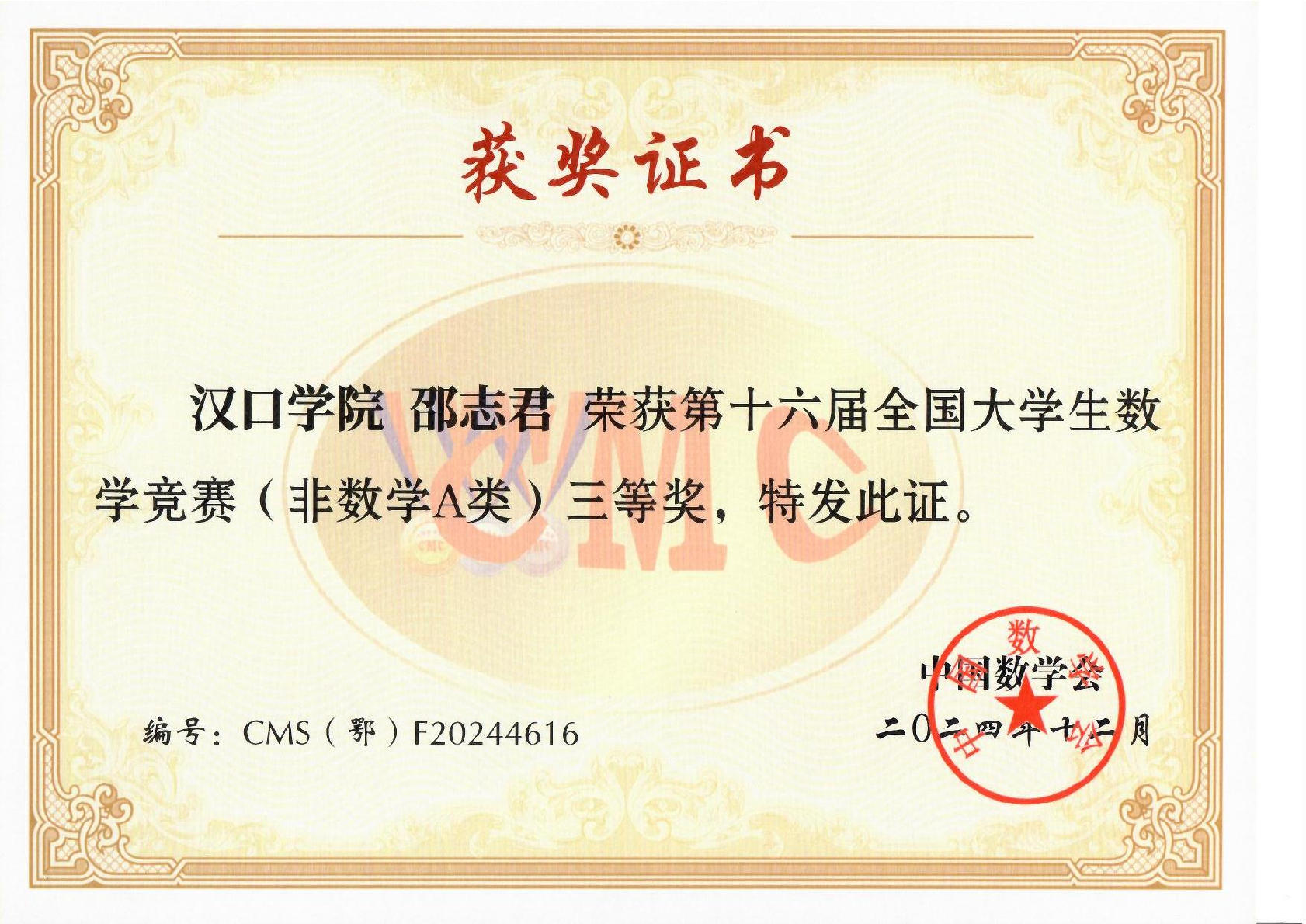 邵志军荣获第十六届全国大学生数学竞赛三等奖