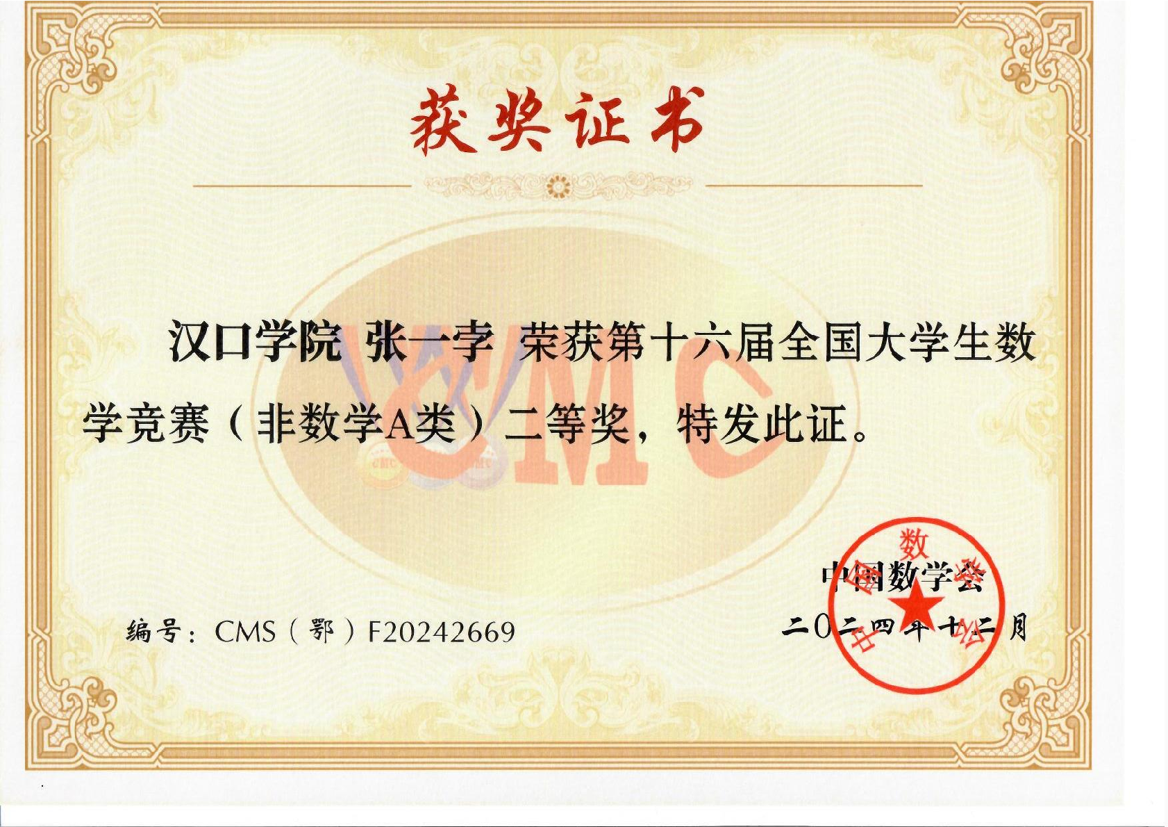 张一孛荣获第十六届全国大学生数学竞赛(非数学A类)二等奖