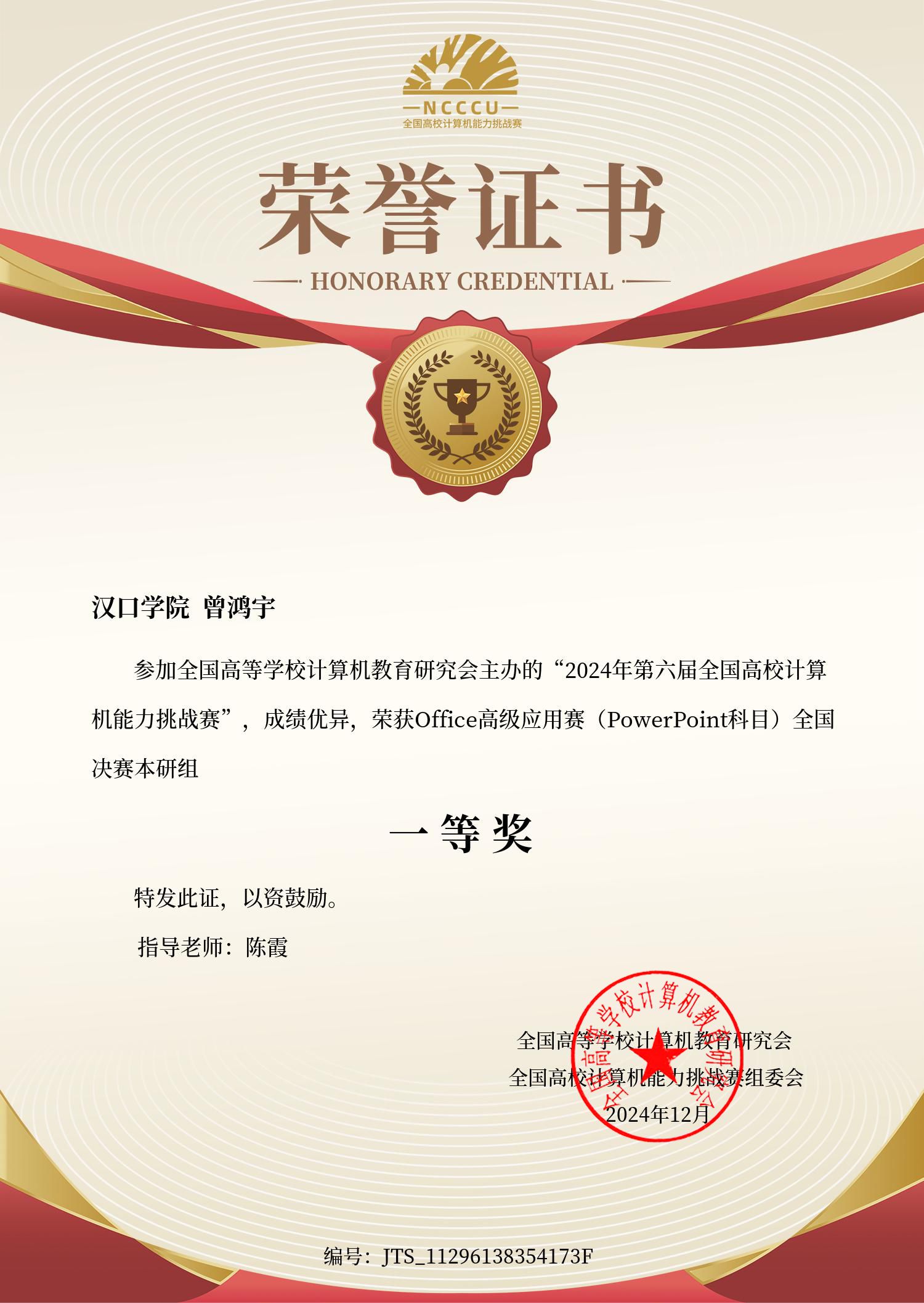 曾鸿宇荣获Office高级应用赛(PowerPoint科目)全国决赛本研组一等奖