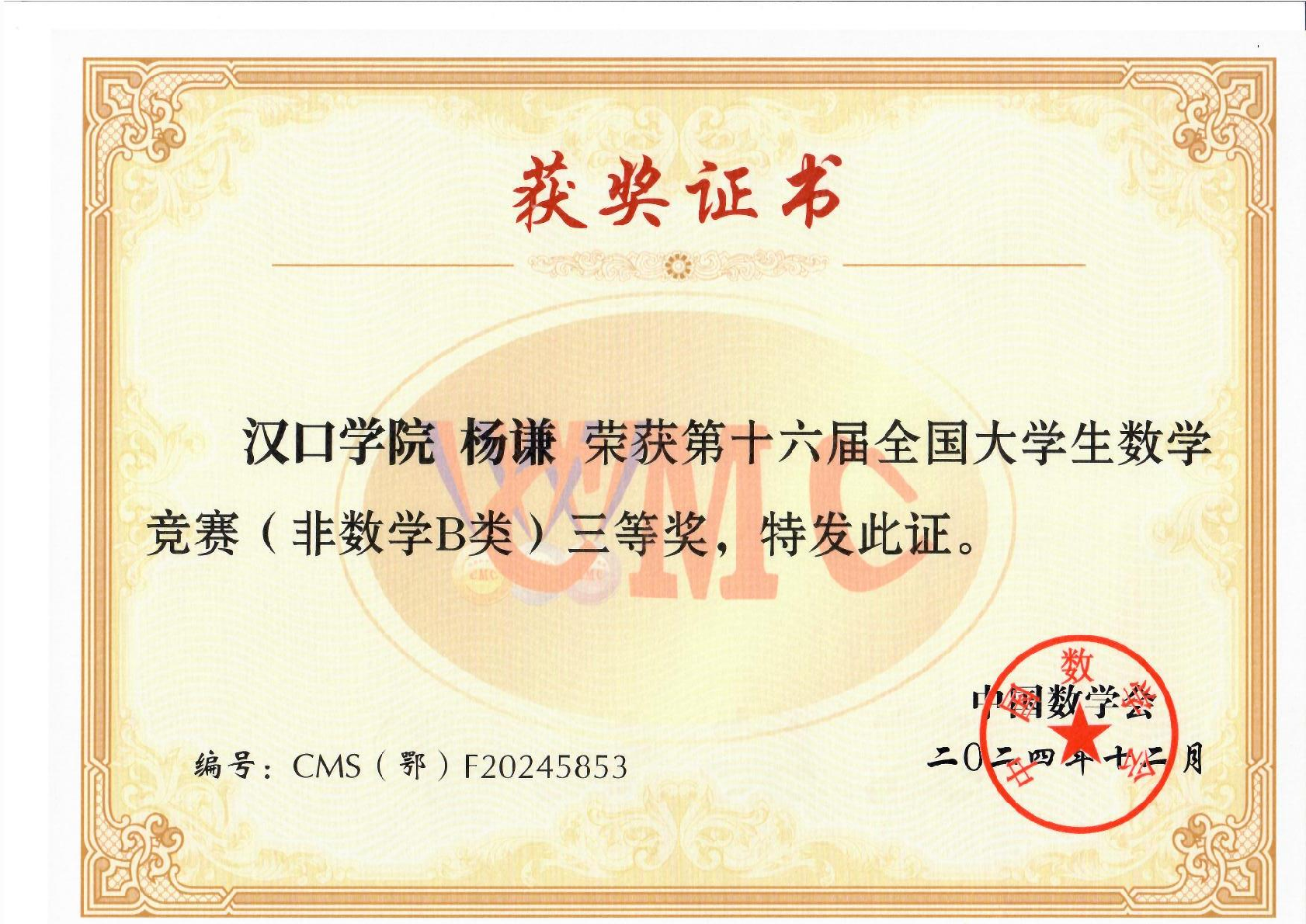 杨谦荣获第16届全国大学生数学竞赛(非数学B类)三等奖