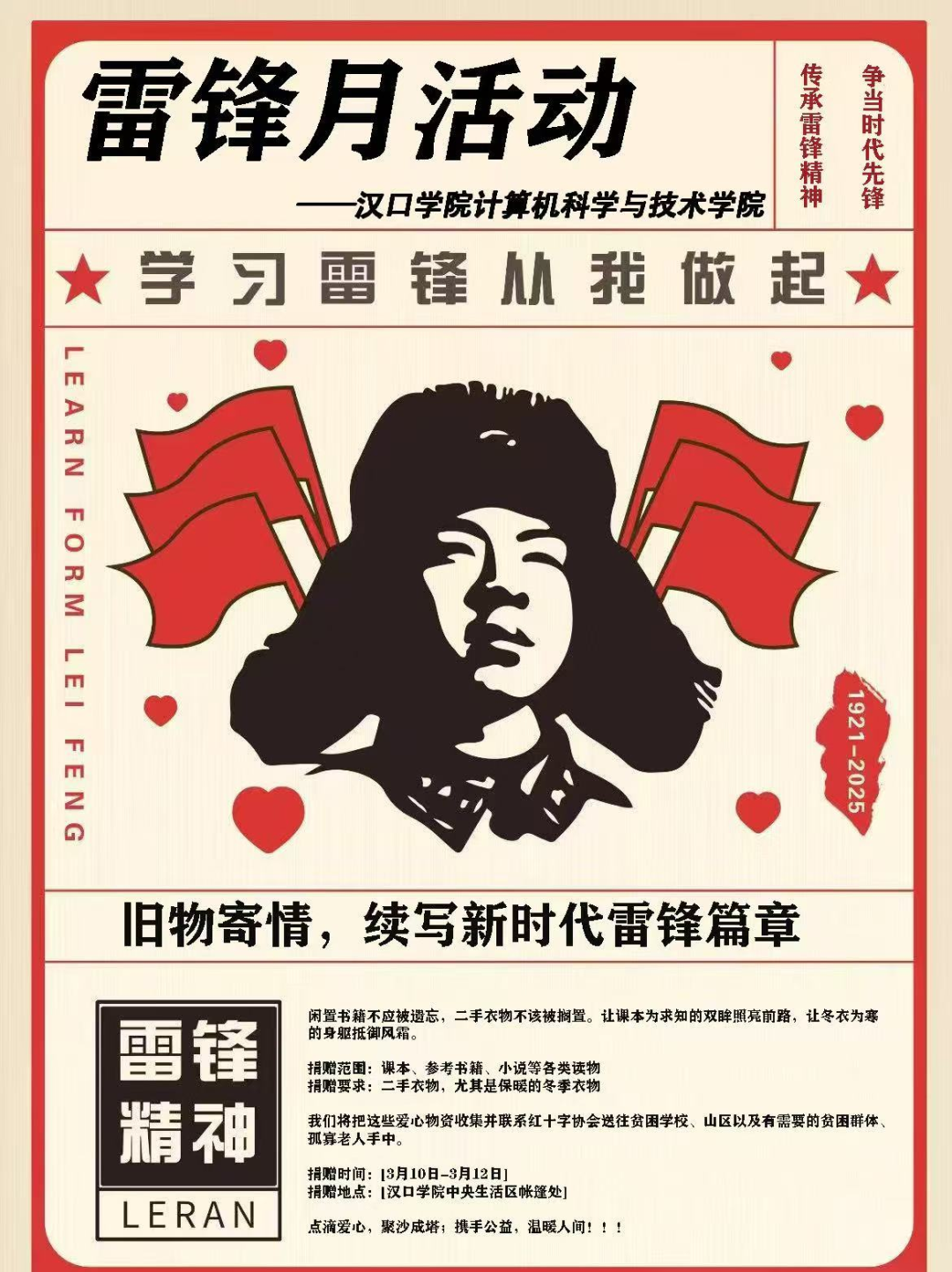近日,我院分团委青马协于3月10日至12日在中央生活区成功举办了雷锋月旧衣物、课本捐赠活动。活动由青马协成员组织策划,得到了全院师生的积极响应和广泛参与。